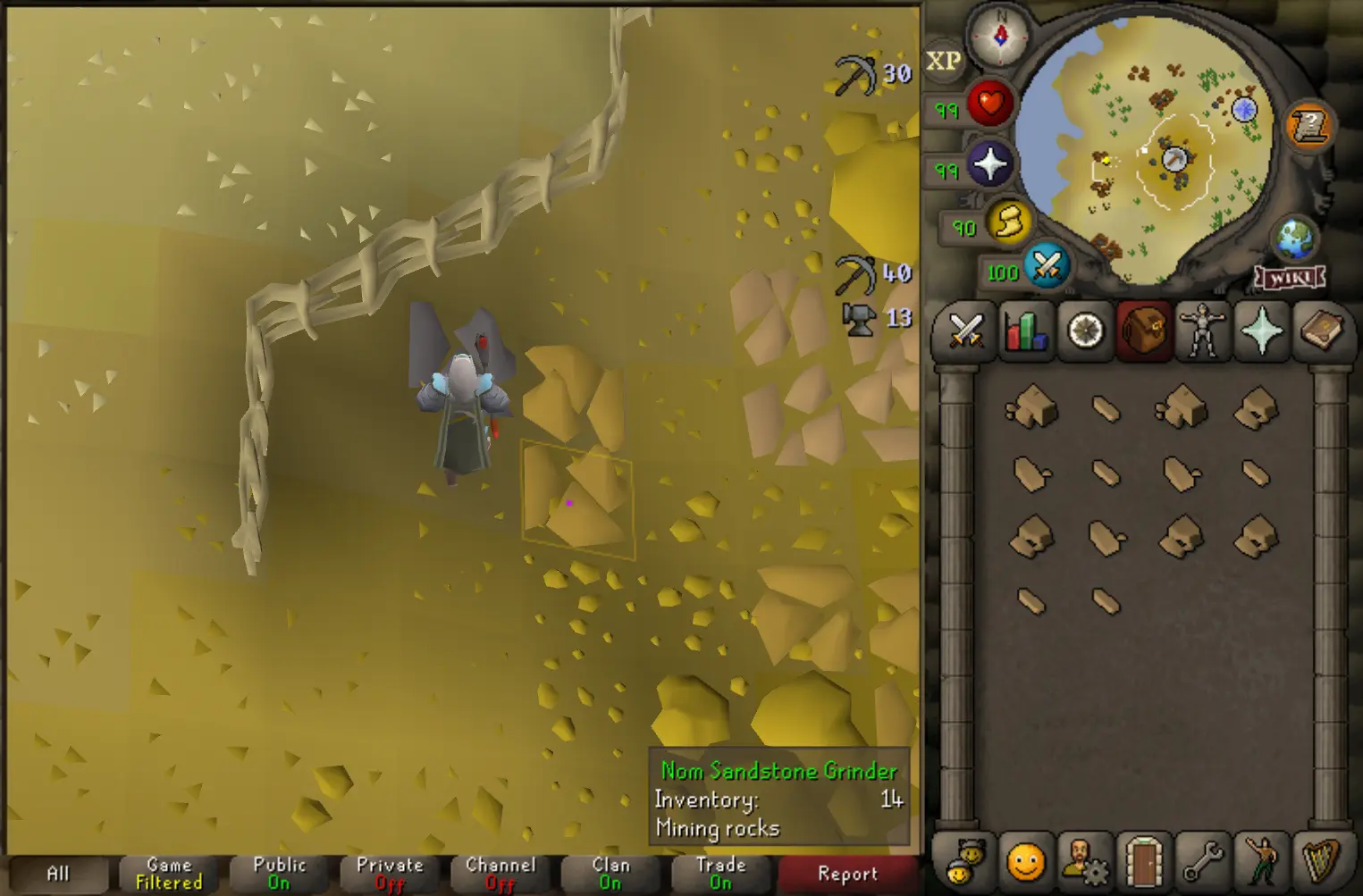 Just west of the quarry, Sandstorm is a grinding machine. Deposit sandstone (unnoted only); sand output depends on the weight of sandstone deposited. Claim buckets of sand from Drew for 50 coins each (plus a bucket). He can store up to 25,000 buckets (banknotes accepted).
